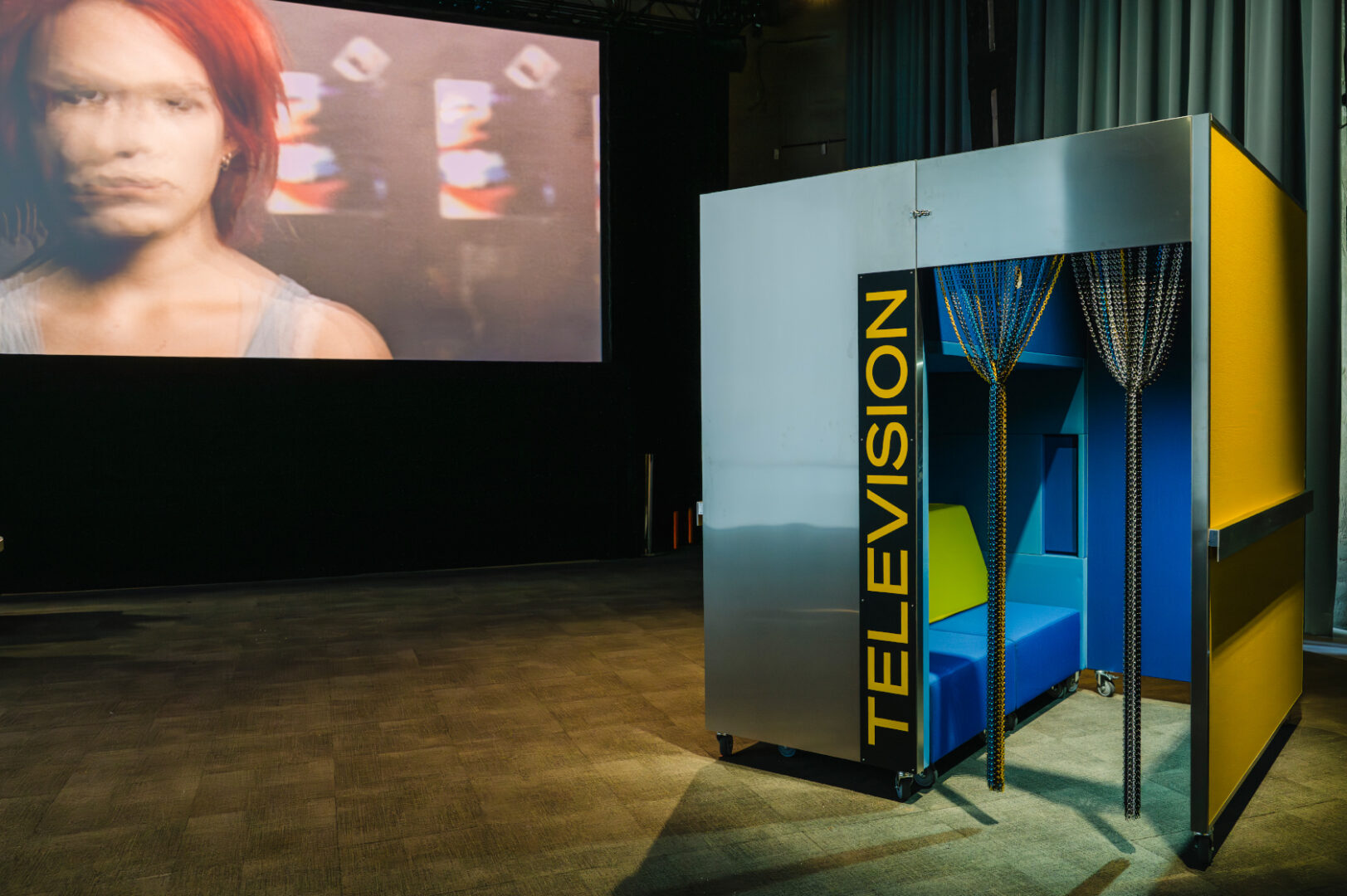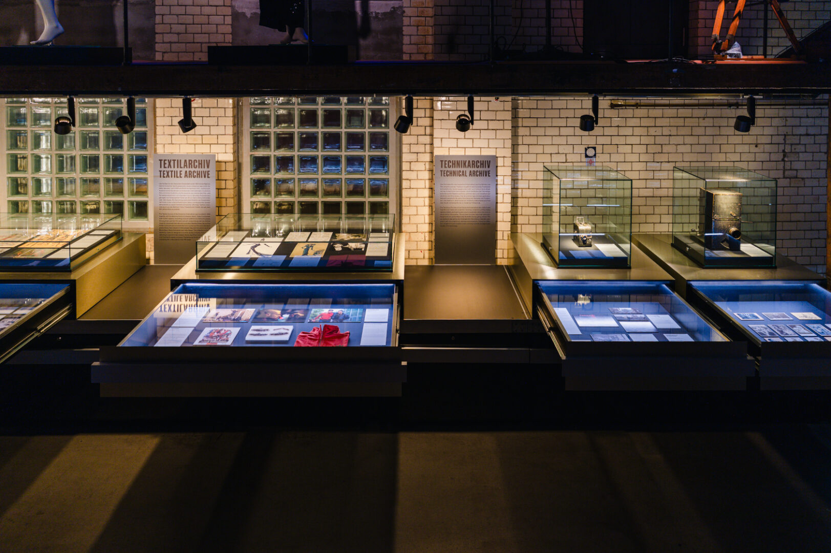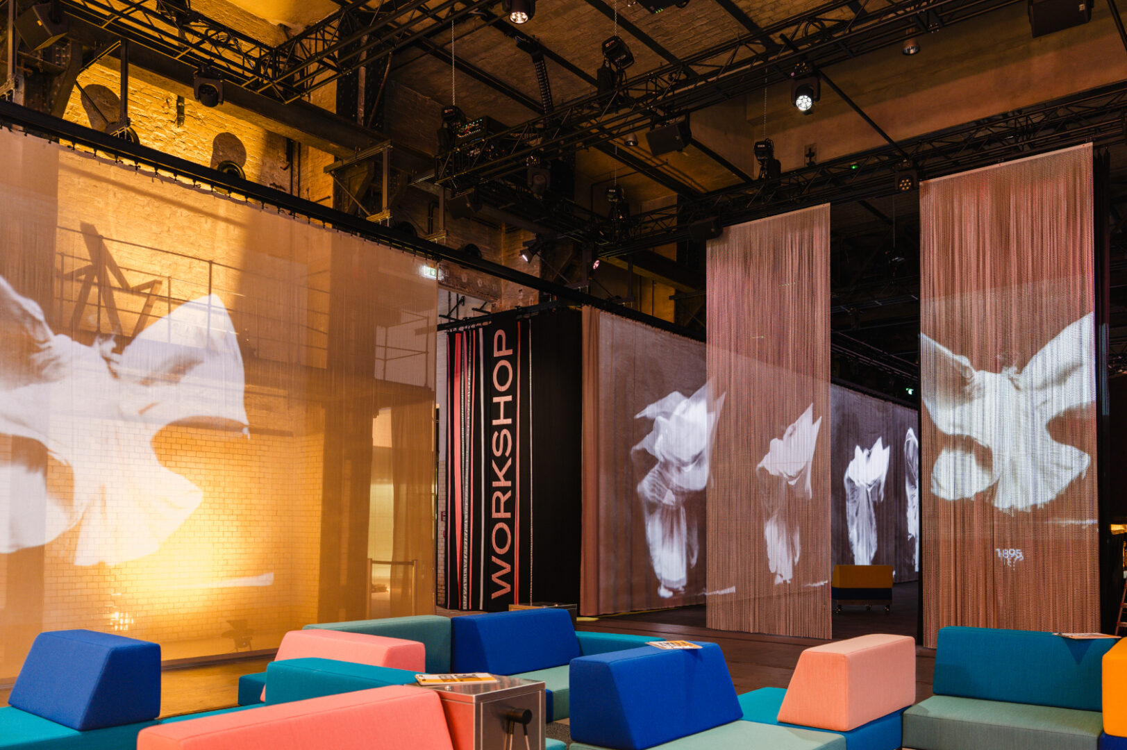 Die Gestaltung greift den Charakter des E-Werks auf und macht den Raum selbst zum Teil der Ausstellung. Textil, Licht und Projektionen strukturieren die Halle, ohne sie zu schließen. So entsteht eine Installation, die sich je nach Blickpunkt und Bewegung verändert.